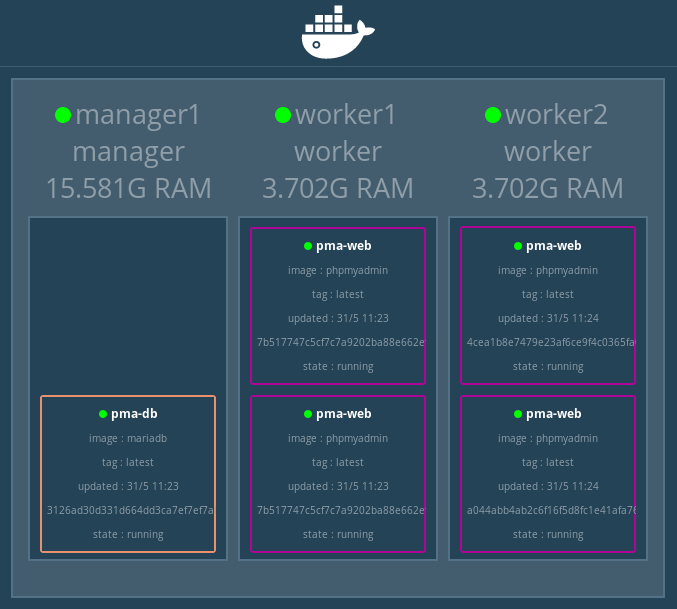 Docker swarm gère des services qui seront associés en interne à un ou plusieurs conteneurs. Dans cette exemple (phpmyadmin), on va le découper en deux services: