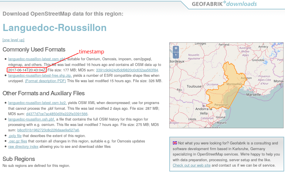 • Le lancement des commandes ci-dessus ne met en base de données que des modifications d'une seule journée. Si plusieurs jours se sont écoulés depuis l'installation, il faudra lancer ces commandes autant de fois que de jours en retard pour rattraper le lag. Le plus simple est d'obtenir le numéro de la dernière mise à jour sur le site de geofabrik et de comparer ce chiffre à celui du fichier state.txt du répertoire de travail d'osmosis (qui est incrémenté de 1 à chaque commande de mise à jour. Si beaucoup de jour ce sont écoulés, il vaut mieux télécharger toutes les mises à jour et les fusionner dans un seule fichier (osmctools: osmconvert).